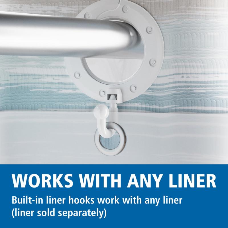 - Requires shower curtain liner (sold separately); built-in hooks work with any liner