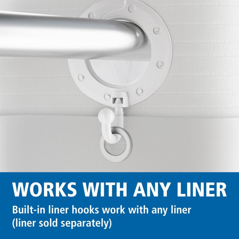 - Requires shower curtain liner (sold separately); built-in hooks work with any liner