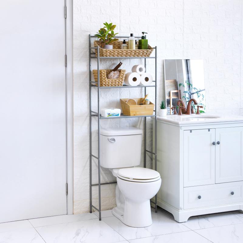 Mainstays Over-the-Toilet Bathroom Storage Shelf Unit Set with Space Saver, Basket and Hooks, Satin Nickel, 4-Piece