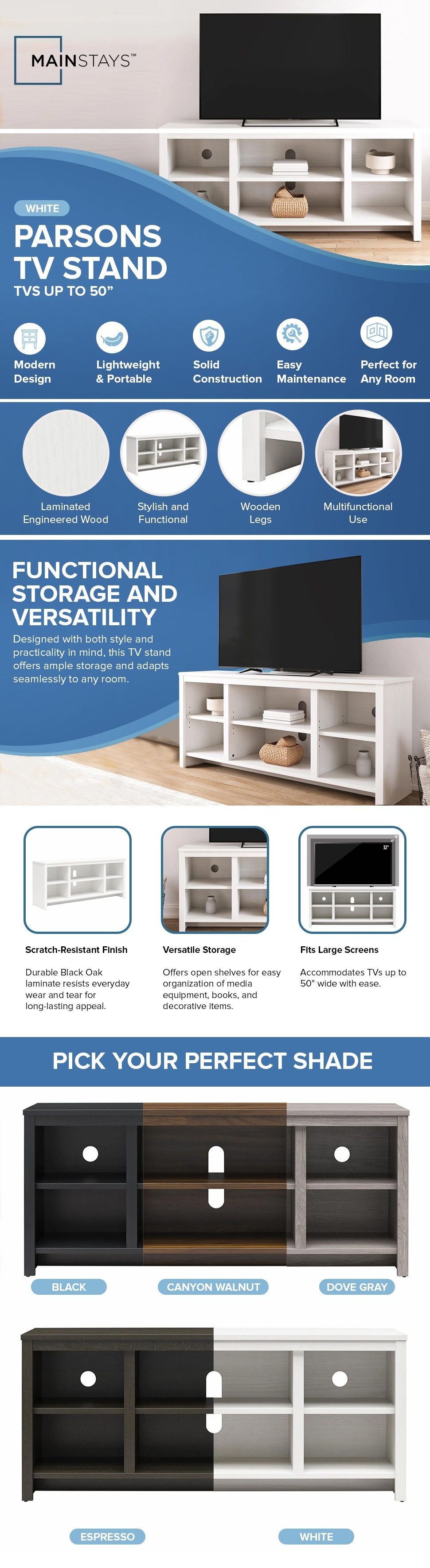 - VERSATILE DESIGN: Update the center of your living room with the Mainstays Parsons TV Stand