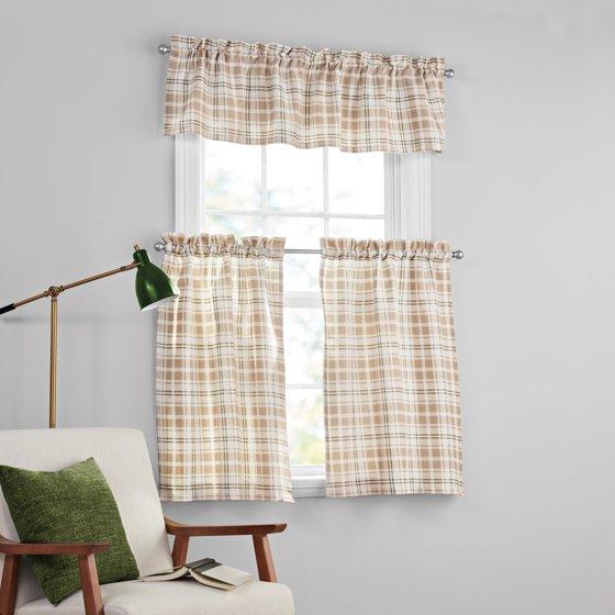 Mainstays Printed Tiers and Valance Set, 3-Piece, Beige, 56" W x 36" L, Indoor Curtain, Adult
