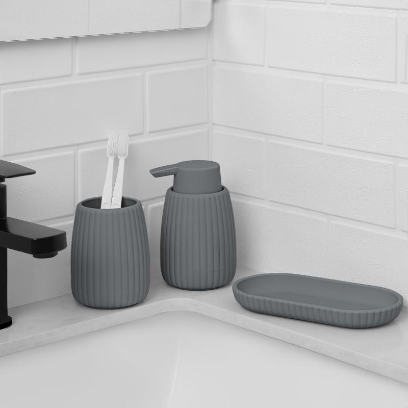 - The Mainstays Rubberized Plastic Ribbed Accessory Tray features a unique ribbed design that adds a touch of sophistication and modern flair to your bathroom decor.