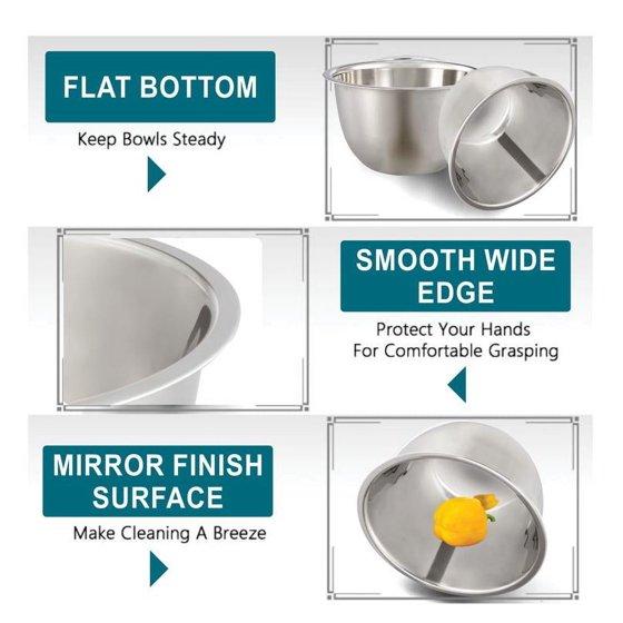 Flat base provides balance and stability during tossing, whipping, preventing ingredient from splashing when mixing. - Use this bowl for making sauces, marinades or baking mixes.