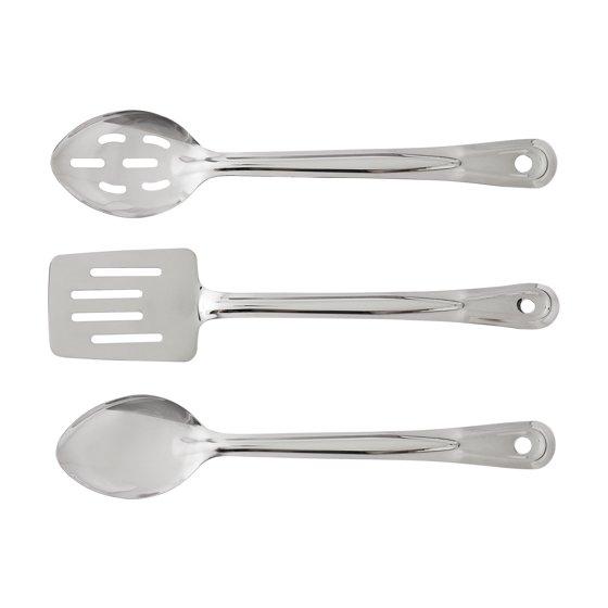 - Includes one 8.5” sauté pan, one 1-qt saucepan, one 2-qt saucepan, one 4-qt Dutch oven, 3 vented glass lids, 1 solid serving spoon, 1 slotted serving spoon, and 1 slotted spatula