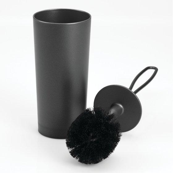 - DISCREET STORAGE - This sleek, black vessel is fitted with a geometric handle that fits securely in your hand when cleaning; This sturdy-bristled brush leaves your porcelain sparkling and sits in a self-contained holder when not in use; The attached round disc shields hands from splashes while serving as a lid cover