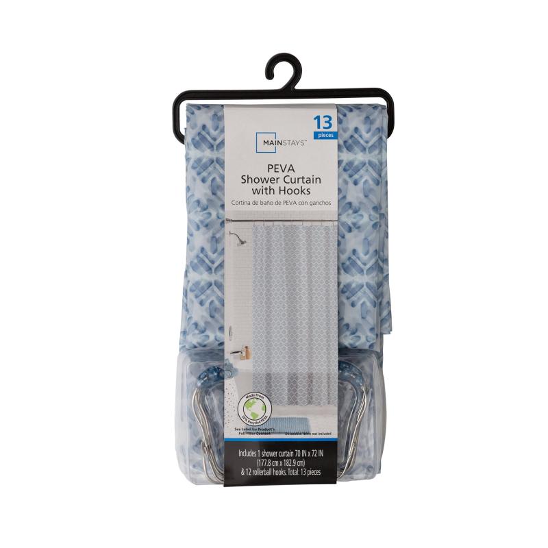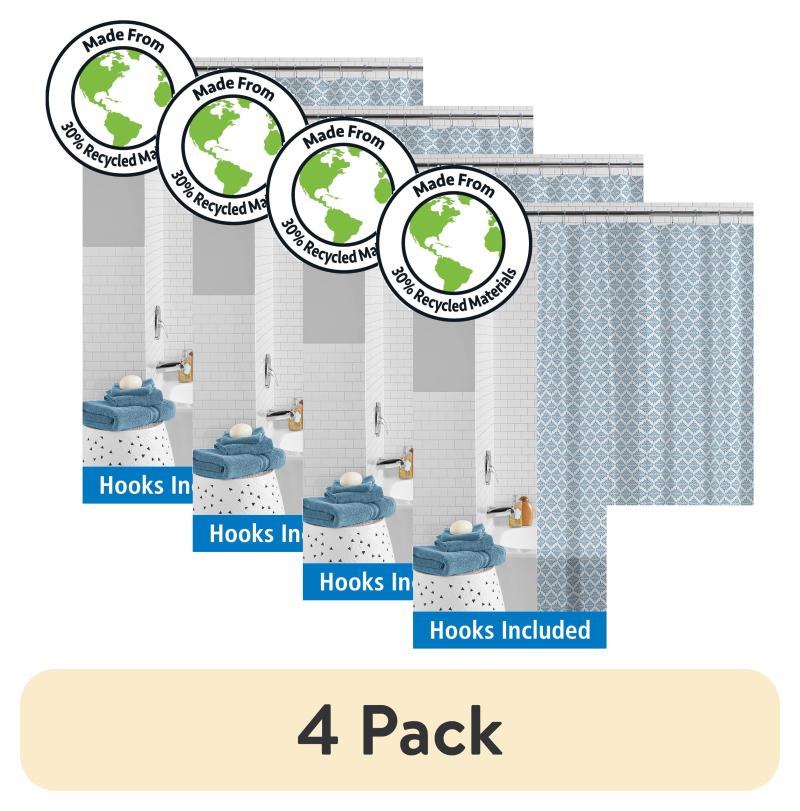 (4 pack) Mainstays Waterproof Medallion Blue 30% Recycled PEVA Shower Curtain Set with Hooks, 13-Piece, Blue