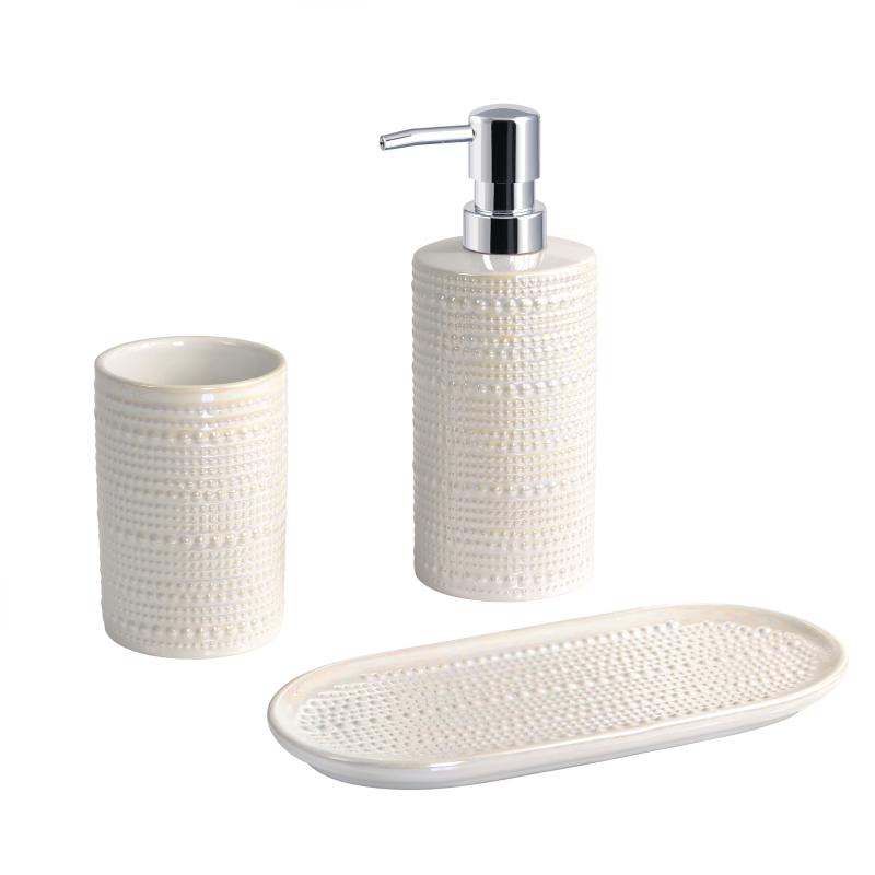 • Made of embossed ceramic with iridescent pearlized finish, sloped interior to display items and keep your countertop neat and organized