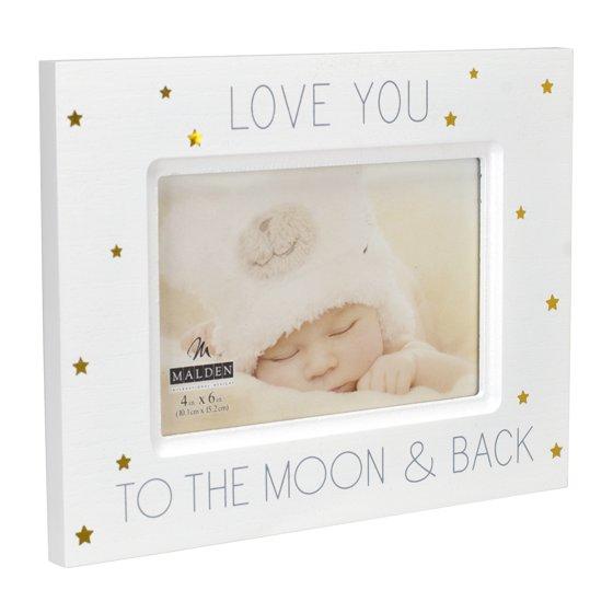 Celebrate the precious moments of your little one's life with the LOVE YOU TO THE MOON AND BACK Baby frame by Malden. This high-quality MDF wood frame features a lightly textured surface adorned with gold foil stars and the heartfelt sentiment "Love you to the moon & back." The frame holds a 4" x 6" horizontal photo, protected by a durable glass front, and can be displayed on a tabletop or wall. Crafted with care, this frame is the perfect way to showcase your cherished memories and create a loving display for your baby's nursery or any special space in your home.