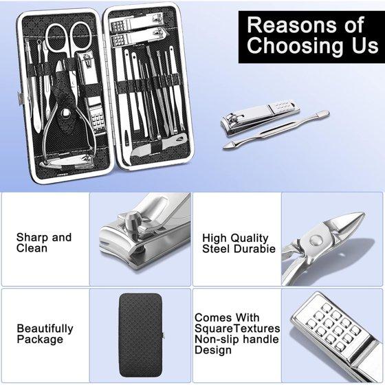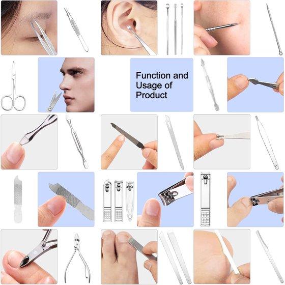 High QualityThe material of manicure Set & nail clippers set are 100% high precision stainless steel.Our stainless steel nail tools are made of high quality steel, which is strong and durable, and it will not fade, extremely hard and sharp.Designed for lifetime use. Manicuring, Pedicuring, Anti-Acne, Exfoliating, Eyebrow Shaping.Manicure SetValue Pack