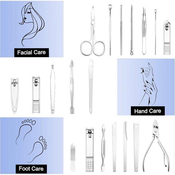 MULTI-FUNCTION The function of most nail clippers set is centered on trimming nails while our kit has a variety of functions including hand care, foot care and facial treatment. The new tools include mini nail clipper for kids, Acne bowl needle and spiral ear spoon that can meet your all kinds of care needs in daily life.