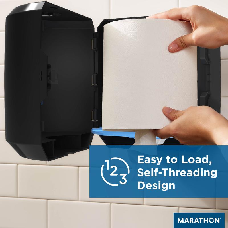 The Marathon Centerpull dispenser is a wall-mounted paper towel dispenser that dispenses soft, absorbent centerpull paper towels. It is easy to load and hold 300-sheet rolls to help reduce the frequency of refills. It is a hygienic option as it helps prevent cross-contamination because you only touch the towel that is yours.