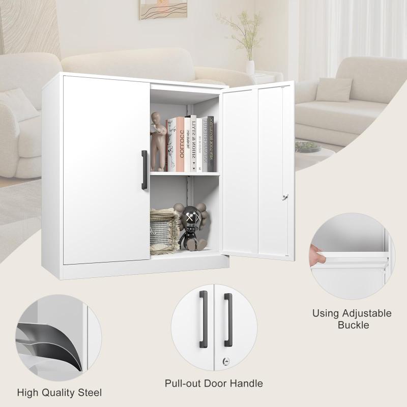 The metal locking cabinet is 13.77"D x 25.98"W x 27.95"H,Weight:30.8 lbs, plenty of interior space, built-in dividers can hold up to 120 lbs, height can be adjusted based on the size of your items, perfect for garage/kitchen storage Ideal for heavy duty items. -