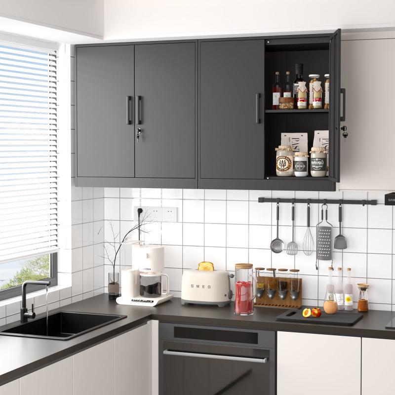 ❤️The metal garage wall storage cabinet has a large capacity to place tools and daily stuff in your room,can save more space in ground.Hidden door handles make cabinets look neater,The lock can keeps your items safety.❤️