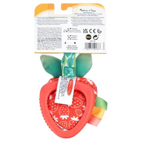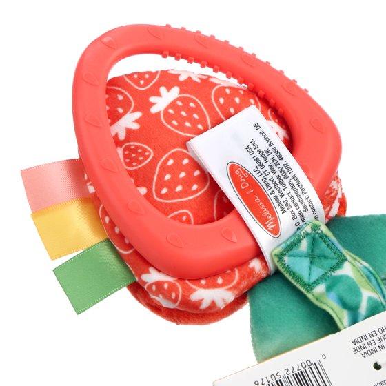 - Attach the 3-piece Melissa & Doug strawberry infant toy with peek-a-boo mirror and silicone teething ring to strollers, diaper bags, high chairs, car seats, and more to keep the fun close at hand