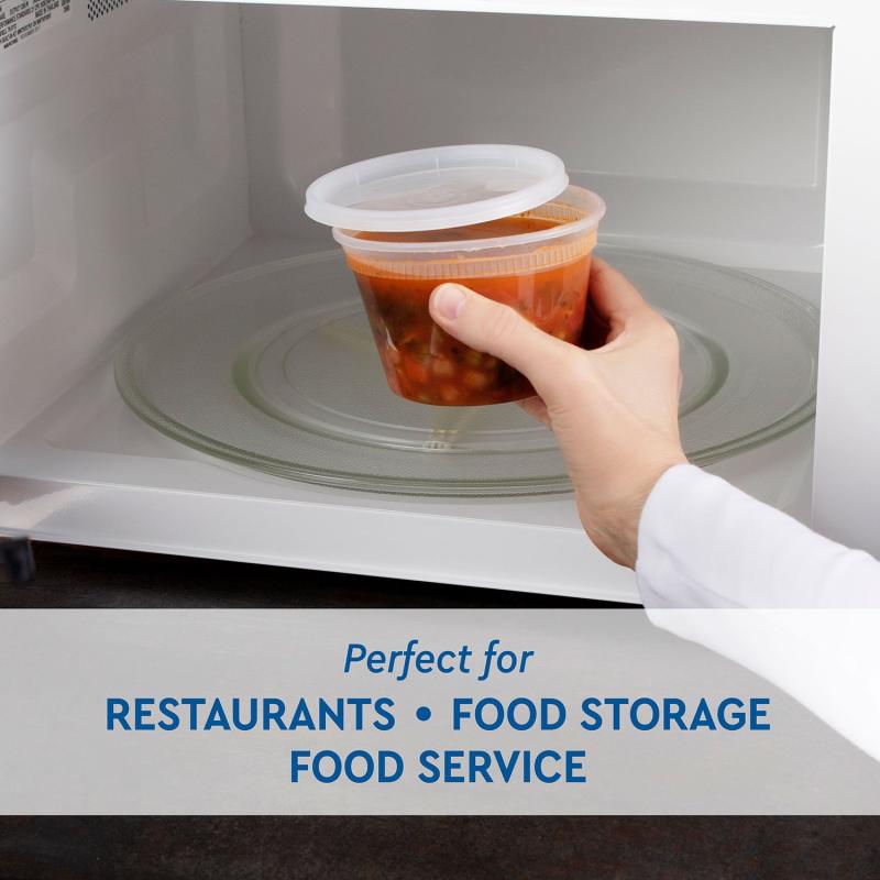 These stackable plastic pint containers hold deli foods, soups and stews or just about anything, and then microwaved to reheat foods. Tight-sealing lids keep the contents contained without leaks. A must-have for kitchens and restaurants.