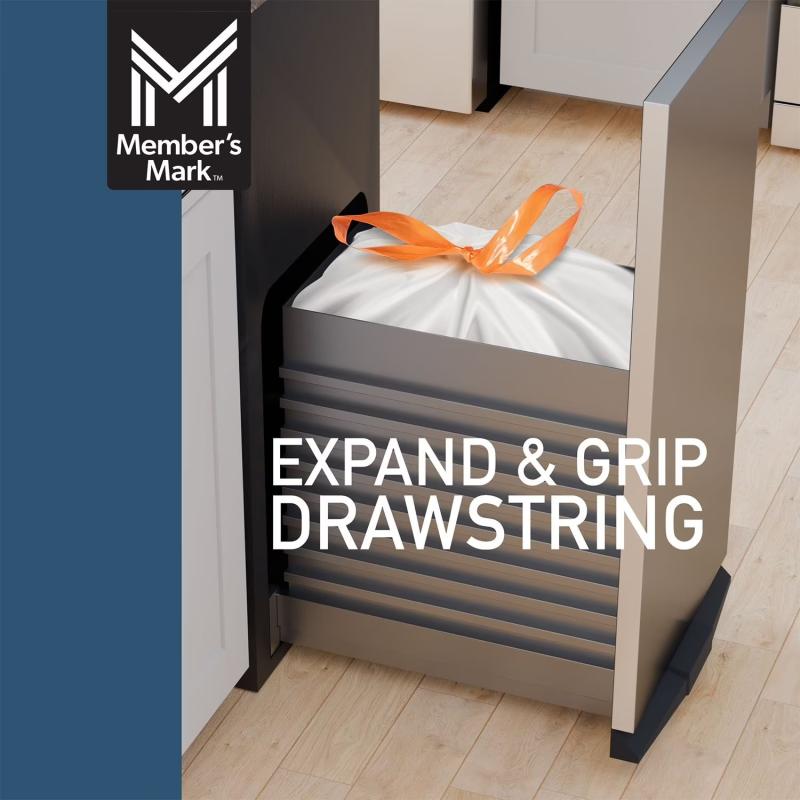 These high-volume bags are simple to install and easy to remove. They feature an expand and grip drawstring that not only seals the bag tightly but also grips the trash can rim to prevent it from slipping off. This drawstring also doubles as a convenient handle for easy lifting and carrying.