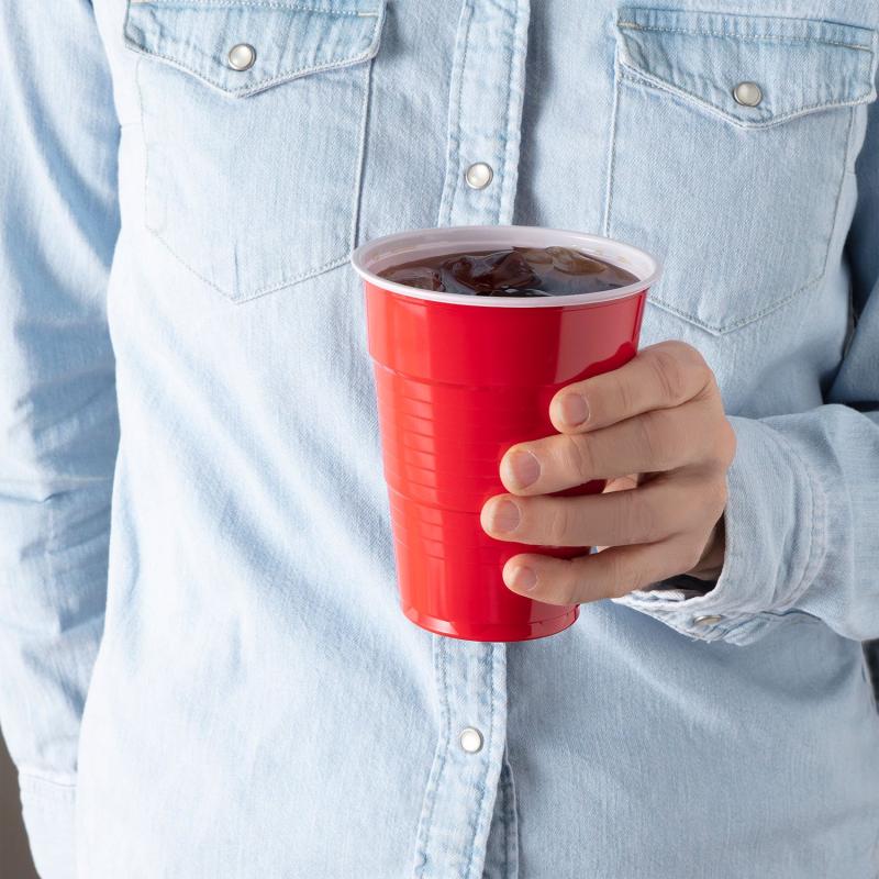 These 18-fl. oz. red plastic cups hold two ounces more than your typical red party cup, making them the perfect size for all kinds of drinks. Whether you're serving beer, soda, mixed drinks or water, these cups will hold just the right amount.