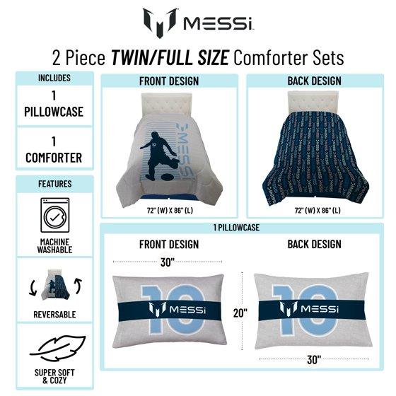 Liven up your child's room with this Messi 2-piece twin/full reversible Comforter Set! This comforter set is made to fit any twin or full-sized bed and includes one comforter (72" x 86"), and one reversible standard pillowcase (20" x 30"). Your child will love this amazing design featuring a navy silhouette of Messi in action in front of a light blue striped pattern with a gray background. And for an extra touch of fun, you can mix it up by flipping the comforter to show a super fun design featuring a repetitive pattern of the Messi logo in blues, pinks, and grays on a solid navy background! Made with 100% high-quality polyester microfiber, this comforter set feel great to the touch and is gentle on your child's skin. Jay Franco products are easy to care for. This comforter set is made from machine washable polyester. Complete the look by shopping the rest of our Messi bedding collection sold separately on!