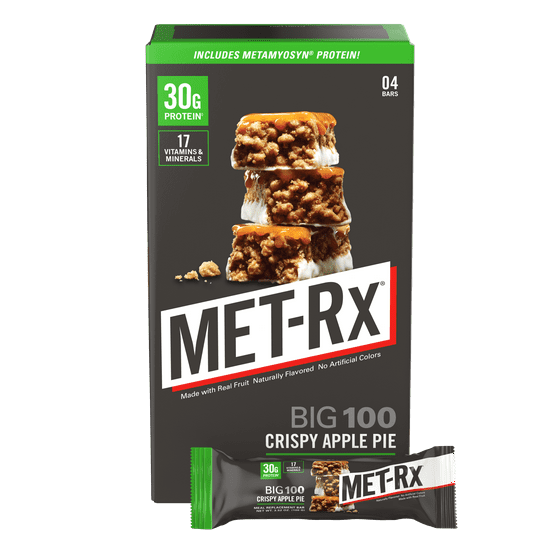 - One 4 count box of MET-Rx Big 100 Colossal Protein Bars, Crispy Apple Pie Meal Replacement Bars, 4 Count