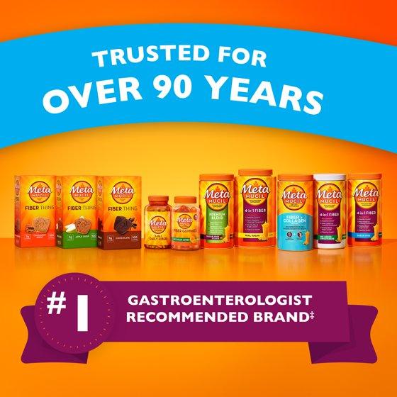 Metamucil is the only fiber leading brand^ made with psyllium husk fiber for 4 health benefits in 1 easy daily fiber supplement*. · Plant-Based Psyllium Husk Fiber · Real Sugar · Smooth-Texture for Easy Mixing · Refreshing Orange Flavor · 2.4 Grams Soluble Fiber Per Serving *THESE STATEMENTS HAVE NOT BEEN EVALUATED BY THE FOOD AND DRUG ADMINISTRATION. THIS PRODUCT IS NOT INTENDED TO DIAGNOSE, TREAT, CURE, OR PREVENT ANY DISEASE. Diets low in saturated fat and cholesterol that include 7 grams of soluble fiber per day from psyllium husk, as in Metamucil, may reduce the risk of heart disease by lowering cholesterol. One serving of Metamucil has 2.4 grams of this soluble fiber. ^Procter & Gamble calculation based in part on data reported by NielsenIQ through its ScanTrack Service for the Fiber Supplements (branded only) for the 52-weeks period ending, 6/01/24 for the Total U.S. Market xAOC, according to the NielsenIQ standard product hierarchy. Copyright 2024, Nielsen Consumer LLC. **Survey of 291 adults who reported feeling lighter and more energetic after the Metamucil Two Week Challenge.