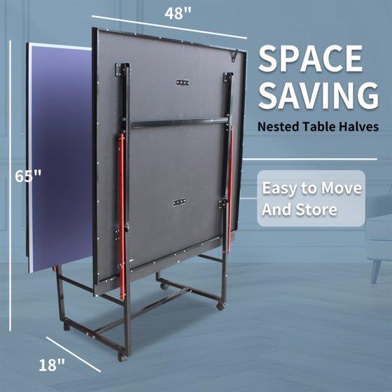 The foldable ping pong table features one-click folding legs and built-in handles. Stand the table tennis table against a wall or slide it under furniture—perfect for apartments and basements.