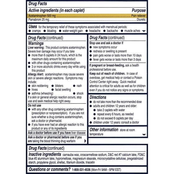 What does PMS mean to you Does it mean menstrual cramps, headache, backache, and muscle aches? When you define the signs of PMS, do you come up with an overwhelming mess of PMS symptoms that plague your body before and during your menstrual cycle? Midol can help relieve your uncomfortable, even painful, period symptoms such as cramps and bloating. With its combination of powerful ingredients and no caffeine, Midol tackles many common premenstrual syndrome woes. Plus, it can be used by teens 12 years and older. Midol contains acetaminophen for pain relief and pamabrom diuretic for water retention. Choose Midol when you need a PMS treatment for more than just period pain. These caplets can treat your period symptoms such as: menstrual cramps, backache, muscle aches, headache, bloating, and water weight because you deserve it