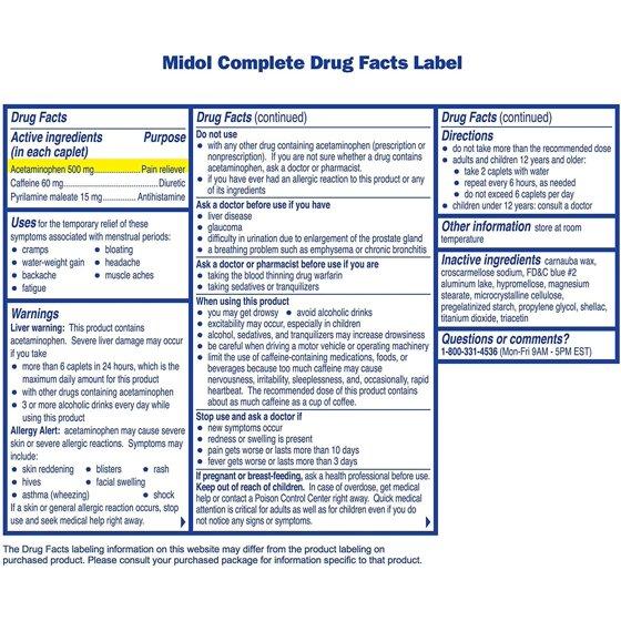 - Contains 500 mg acetaminophen, 60 mg caffeine, and 15 mg pyrilamine maleate (diuretic)