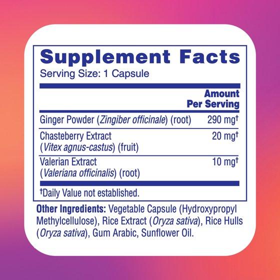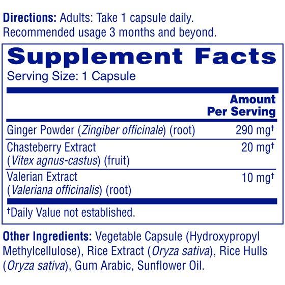 ginger powder, chasteberry extract, valerian extract. Other ingredients: vegetable capsule, rice extract, rice hulls, gum arabic, sunflower oil