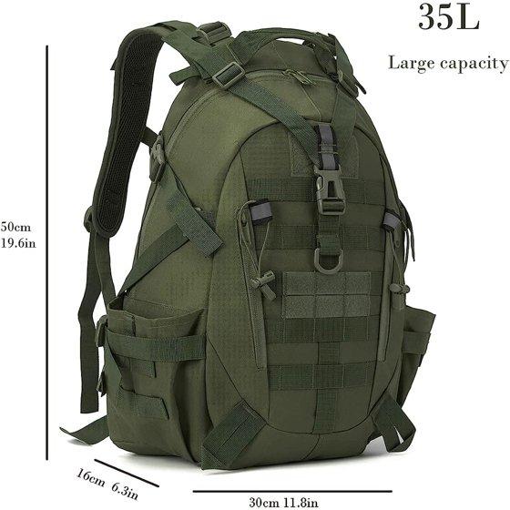 - 【DURABLE & RESISTANT】This 35-liter tactical backpack is made of 900D polyester fabric and pvc, high density, durable and water resistant. Designed with double-stitched heavy duty zippers , wear-resistant and utility-style cord pulls, side and front load compression system, padded inner compartment to protect valuable items. 【MOLLE System】 The Molle backpack features several molle webbing on the front and side for attaching additional tactical pouches or outdoor gear to expand space.Molle strap of the survival backpack is attached with additional function for outdoor gear, and the straps at the bottom can be used to hold , sleeping pad or roll-up mattress. And sticker padding to add your favorite patches. 【SAFE& COMFORT】There are 3 reflective strips on the front of the tactical bag. When the light hits the reflective strip, it will reflect the light, allowing you to be observed in the dark, ensuring your safety to a certain extent.Backpack with breathable shoulder straps and back with thick mesh padding on both sides of the back, an adjustable waist belt and a high chest strap allows breathable and comfortable.