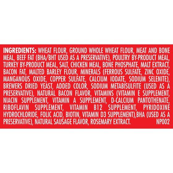Wheat Flour, Ground Whole Wheat Flour, Meat and Bone Meal, Beef Fat (BHA/BHT Used as a Preservative), Poultry By-Product Meal, Turkey By-Product Meal, Salt, Chicken Meal, Bone Phosphate, Malt Extract, Bacon Fat, Malted Barley Flour, Minerals (Ferrous Sulfate, Zinc Oxide, Manganous Oxide, Copper Sulfate, Calcium Iodate, Sodium Selenite), Brewers Dried Yeast, Added Color, Sodium Metabisulfite (Used as a Preservative), Natural Bacon Flavor, Vitamins (Vitamin E Supplement, Niacin Supplement, Vitamin A Supplement, D-Calcium Pantothenate, Riboflavin Supplement, Vitamin B12 Supplement, Pyridoxine Hydrochloride, Folic Acid, Biotin, Vitamin D3 Supplement), BHA (Used as a Preservative), Natural Sausage Flavor, Rosemary Extract. NP002.