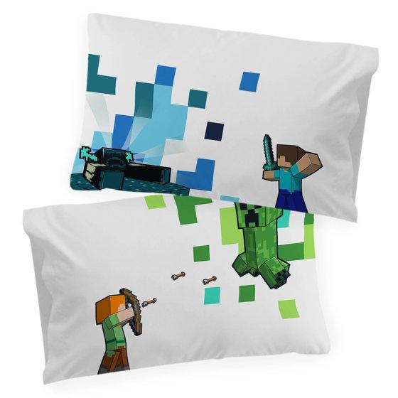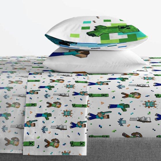 Give your bedroom a makeover with this exciting Minecraft 4-Piece Queen Sheet Set. Bring the fun and friendly adventures of Minecraft to your room! This complete sheet set includes a high-quality fitted sheet, flat sheet, and two reversible pillowcases for a coordinated Minecraft theme. All components are crafted from an extremely soft microfiber material with vibrant colors and a bold design. Additional Minecraft bedding components like comforters, blankets, and throws sold separately only on Walmart.com! CARE INSTRUCTIONS: Wash before use. Machine wash cold. Wash dark colors separately. Only non-chlorine bleach when needed. Tumble dry low. Warm iron only.
