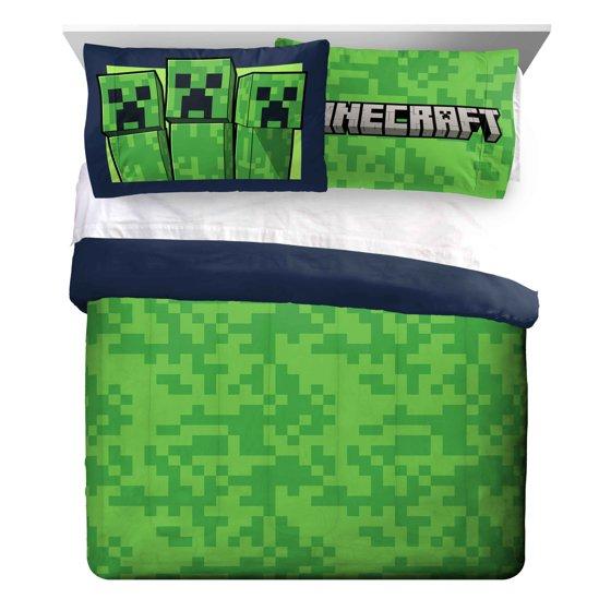 Transform your room with this Minecraft 3-Piece Queen Reversible Comforter Set. The colorful, front design of this comforter features Minecraft block images, while the reverse of the comforter features a simple but vibrant green Creeper pattern. This reversible Minecraft comforter measures at 86" x 86", making it the perfect fit for any queen size bed, along with one 20" x 30" pillowcase to complete the look. This 3-piece comforter set is made entirely of 100% super soft microfiber and is machine washable for easy and convenient care. Coordinating queen sheet sets, blankets and throws are sold separately only on.