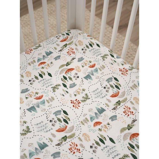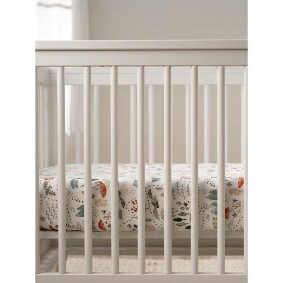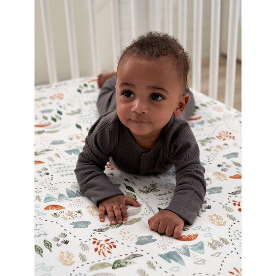 Our soft, safe fitted infant crib sheets are made with soft, gentle fabrics that your baby will adore. We had our essentials independently certified with STANDARD 100 by OEKO-TEX so that you don’t have to worry about harmful substances in your baby’s nursery. Tie together your perfect baby nursery with this comfy crib sheet. This pack includes one white adventure print baby fitted crib sheet.