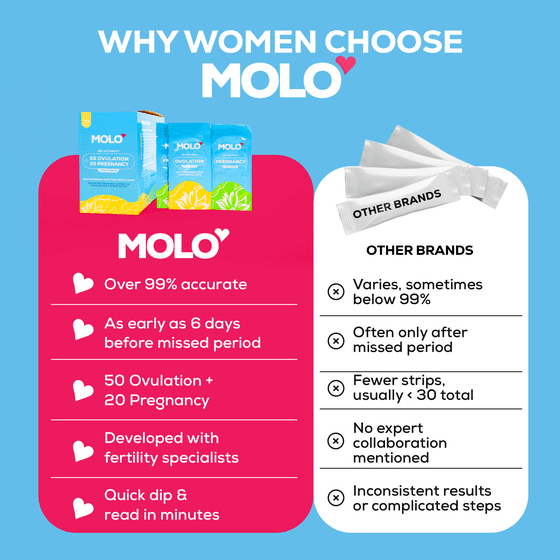 - ACCURATELY TRACK YOUR FERTILE DAYS: With over 99% accuracy, MOLO test strips help you pinpoint your most fertile days, maximizing your chances of conception and giving you clarity on the best time to try.