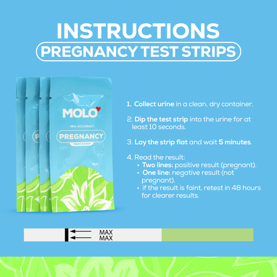 - EASY-TO-USE STRIPS: The MOLO test strips are designed for hassle-free use. For ovulation tests, just dip the strip into urine for 10 seconds and wait 10 minutes for results. For pregnancy tests, dip and wait 5 minutes for clear results.