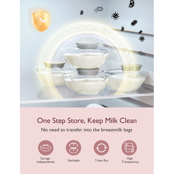 - Convenient Storage: Made of Tritan, a safe, durable, and eco-friendly material. The stackable milk collector can store breastmilk independently. Just seal with the silicone lid and put it in the bag or refrigerator. No need to transfer into the breastmilk bags. One Step Store, Keep Milk Clean.