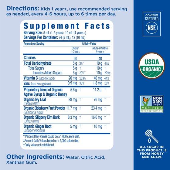 Proprietary Blend of Organic Agave Syrup and Organic Honey Organic Ivy Leaf Organic Elderberry (fruit) 64:1 Extract Organic Slippery Elm Bark Organic Ginger Root