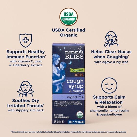 - Contains 1-4 fl oz bottle of Mommy's Bliss Organic Night Time Cough Syrup with dispensing cup (recommended for kids 1 year and up)