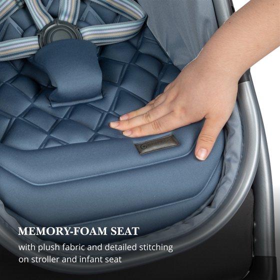 - Memory-foam seat with plush fabric and detailed stitching on stroller and infant seat