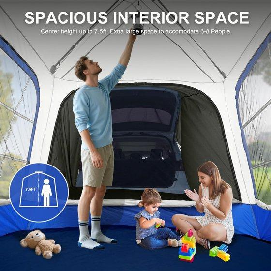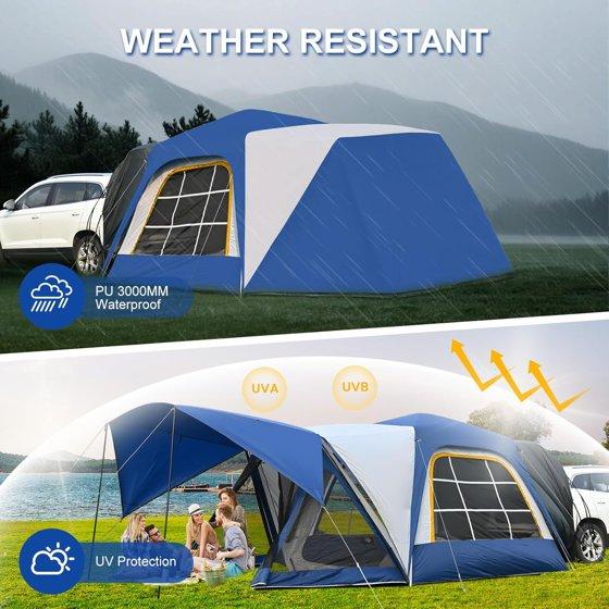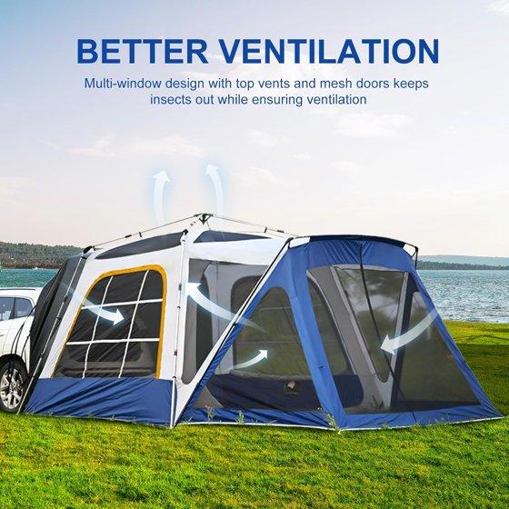 - Large SUV Tent 4-6 People:With an 8.2ft x 8.2ft interior and a 87in center height, this SUV car tent comfortably fits 4-6 people?and allows you to move freely without bending.