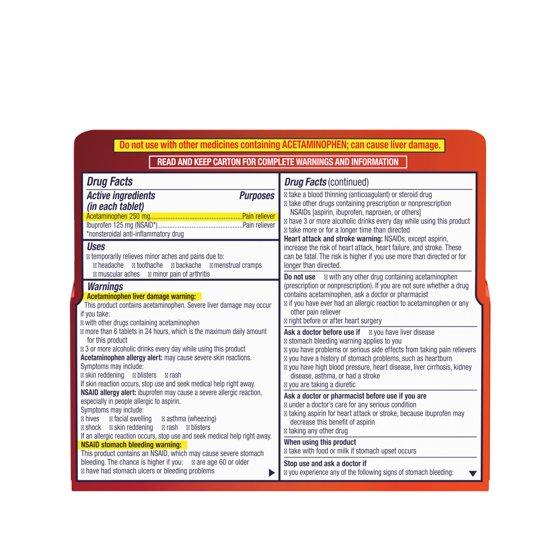 Active ingredients (in each tablet) Acetaminophen 250 mg Ibuprofen 125 mg (NSAID*) Purposes Pain reliever Pain reliever *nonsteroidal anti-inflammatory drug Inactive ingredients colloidal silicon dioxide, corn starch, croscarmellose sodium, crospovidone, microcrystalline cellulose, polyethylene glycol, polyvinyl alcohol, povidone, pregelatinized starch, stearic acid, sucralose, talc, titanium dioxide