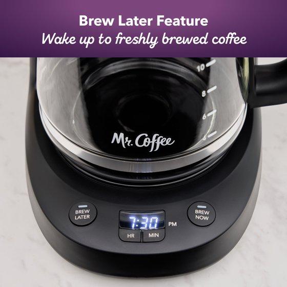 Enjoy delicious coffee made simple whenever you'd like with the Mr. Coffee® 12-Cup Programmable Coffee Maker. The automatic drip coffee maker features convenient Brew Later programming that makes it easy to schedule brewing ahead of time, so you can wake up to freshly made coffee any time you want. The updated design includes a Grab-a-Cup Auto Pause, so you can pour a cup of coffee before the brewing cycle is complete. Plus, the 2-Hour Auto-Shutoff feature automatically turns off the coffee machine so you don't have to worry. Includes a dishwasher-safe, reusable coffee filter, to save money and create less waste. Just sit back and enjoy sipping great-tasting coffee just the way you like it, with the Mr. Coffee® 12-Cup Programmable Coffee Maker.