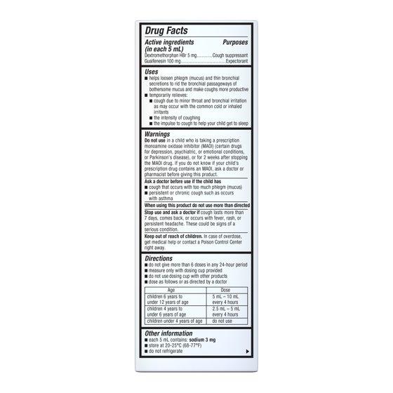 Active Ingredients: In Each 5 ml: Dextromethorphan HBr (5 mg), Guaifenesin (100 mg). Purpose: Cough Suppressant, Expectorant. Inactive Ingredients: Acesulfame Potassium, Anhydrous Citric Acid, D&C Red 33, FD&C Red 40, Flavor, Glycerin, Maltitol, Propylene Glycol, Purified Water, Saccharin Sodium, Sodium Benzoate, Sorbitol, Xanthan Gum.