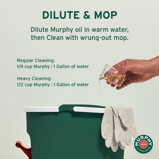 Directions for Use on Floors: Dilute 1/4 cup Murphy in 1 gallon warm water. For heavy cleaning, dilute 1/2 cup Murphy per gallon. Clean well with wrung-out mop, and mop any excess water. No visible residue, no rinsing required.