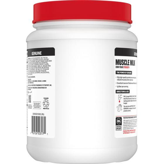 - KEY FEATURES - Based on 1 serving, Muscle Milk Genuine Protein Powder contains 32g high-quality protein, 2g sugar, and an excellent source of Calcium and Vitamins A, C & D