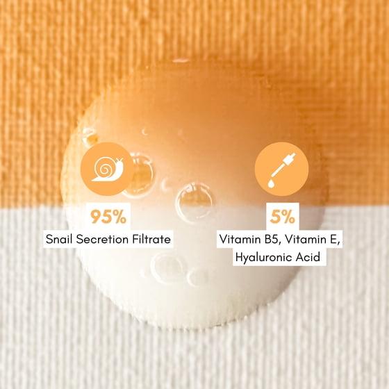Snail Secretion Filtrate, 1,2-Hexanediol, Panthenol (Pro-Vitamin B5), Caprylic/Capric Triglyceride, Sodium Hyaluronate, Tocopherol (Vitamin E), Sphingomonas Ferment Extract, Cellulose Gum, Sclerotium Gum, Aqua/Water/Eau, Sodium Polyacrylate, Polyglyceryl-10 Laurate, Propanediol, Microcrystalline Cellulose, Tromethamine, Carbomer, Ethylhexylglycerin