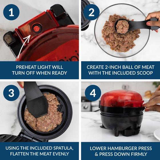 - SPATULA-SCOOP: Create 2-inch balls of hamburger meat and flatten to perfection using the included Spatula-Scoop.
