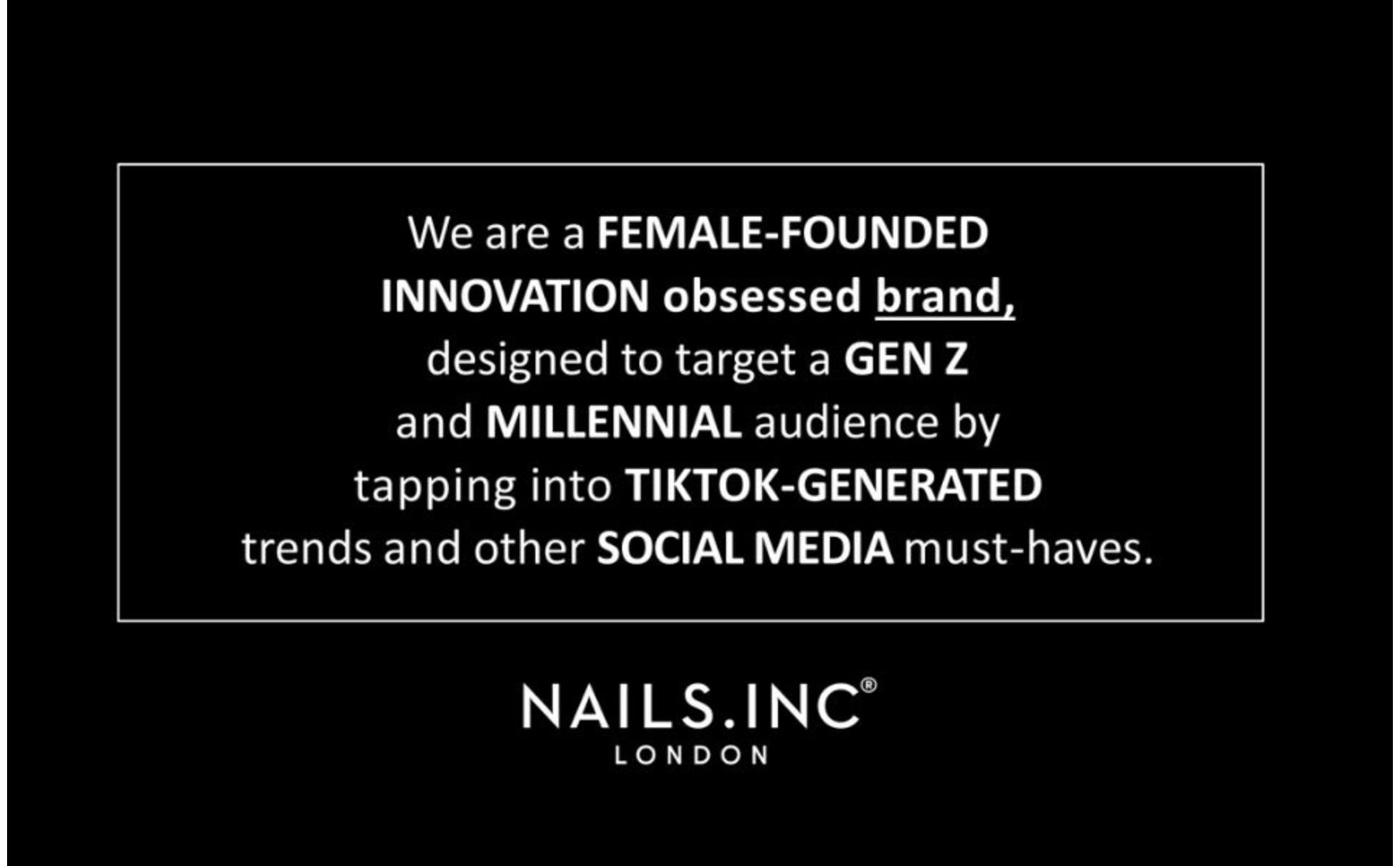 • Nails Inc London - Is a female-founded innovation obsessed brand, tapping into TikTok generated trends and other social media must haves. We offer a range of luxury nail polish and accessories, perfect for women and girls looking for their perfect mani or pedi