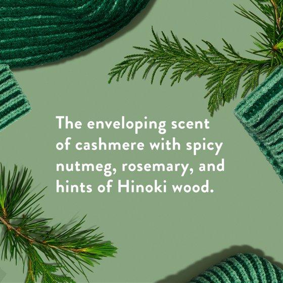 - Envision wrapping yourself in cashmere with spicy nutmeg and rosemary. Hinoki wood completes this warm, luxurious scent. Perfect for cozy holiday nights after memorable gatherings.