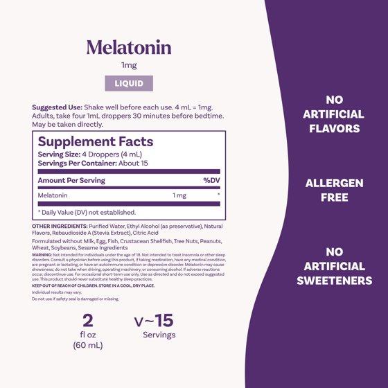 - LIQUID MELATONIN: A tasty and convenient dietary supplement to support sleep, this adult melatonin dietary supplement does not contain common food allergens and provides up to a 15 servings(1)